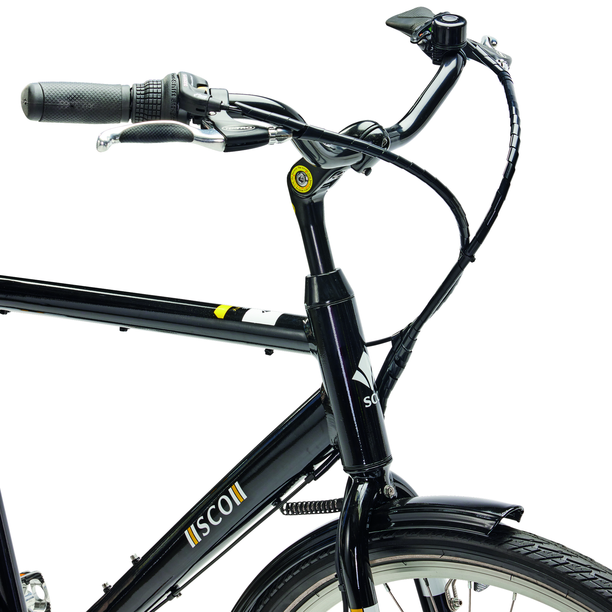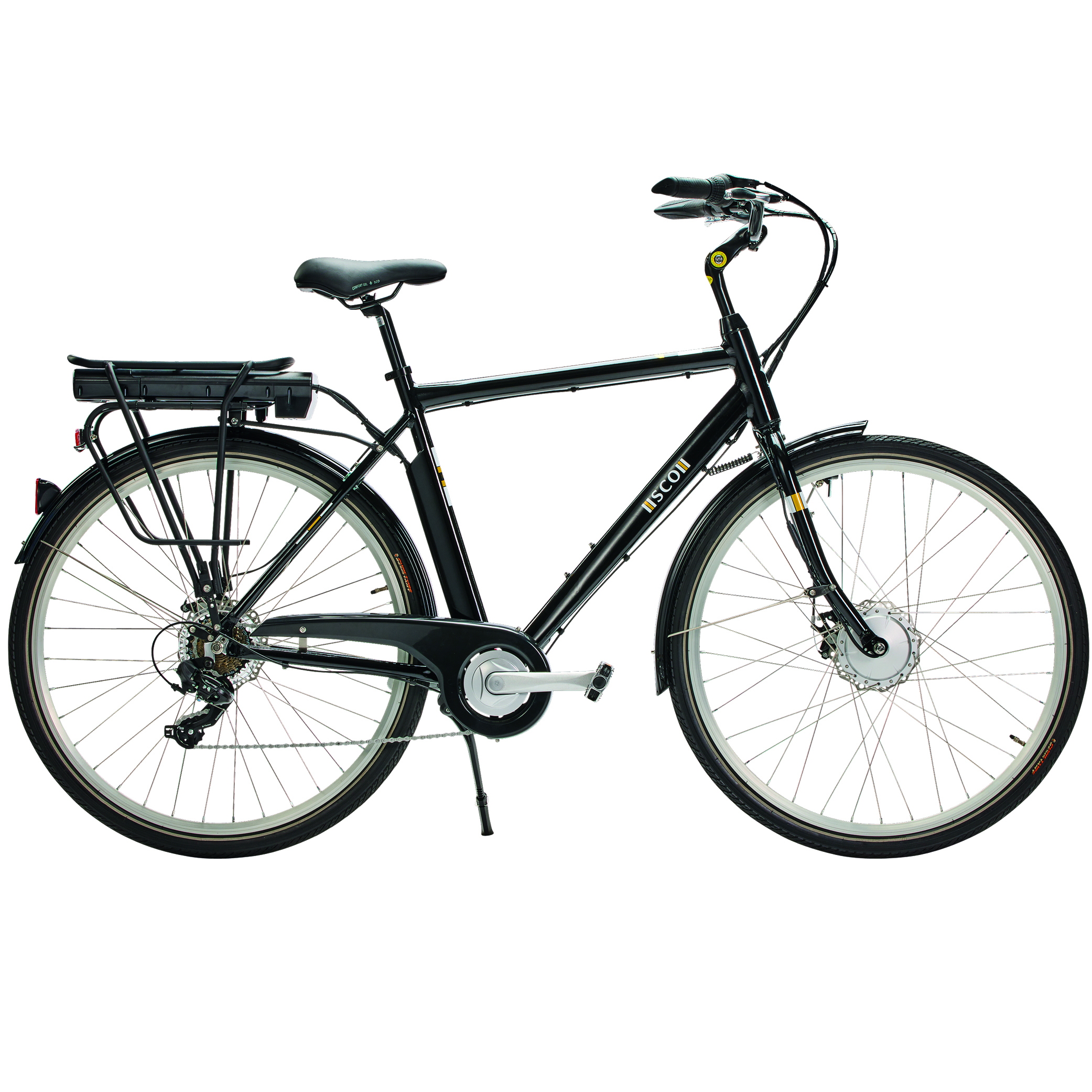 SCO E-CITY er en elcykel med 55 cm aluminiumsstel og 28″ hjul, egnet til daglig transport på asfalt og faste cykelstier. Elsystemet fra Bafang med forhjulsmotor assisterer under pedaltråd og gør det lettere at holde et stabilt tempo. Cyklen har 7 udvendige Shimano Revoshift-gear, som giver mulighed for at justere farten efter terrænet. Mekaniske skivebremser foran og bagpå sørger for kontrolleret opbremsning. Batteriet på 10,4AH leverer strøm til motor og elektronik.